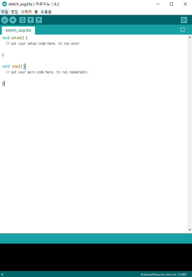 아두이노 개발 프로그램을 실행하면 처음에 빈 코드창으로 된 다음 화면을 확인 가능한데요.(코드를 작성하는 방식이나 몇몇 기능들은 이후에 다시 정리해서 올릴께요.)