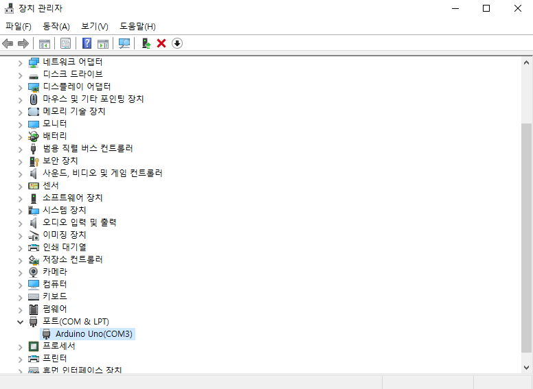 장치 관리자 프로그램이 실행되는데 여기서 '포트(COM & LPT)' 에서 Arduino Uno 가 정상적으로 인식되어 있는지를 확인할 수 있는데요. (가끔 호환보드나 사용자들의 커스텀 보드를 연결하면 Arduino 라고 인식되지 않고 다른 명칭으로 인식되는 경우가 있는데 사용에는 문제가 없어요)