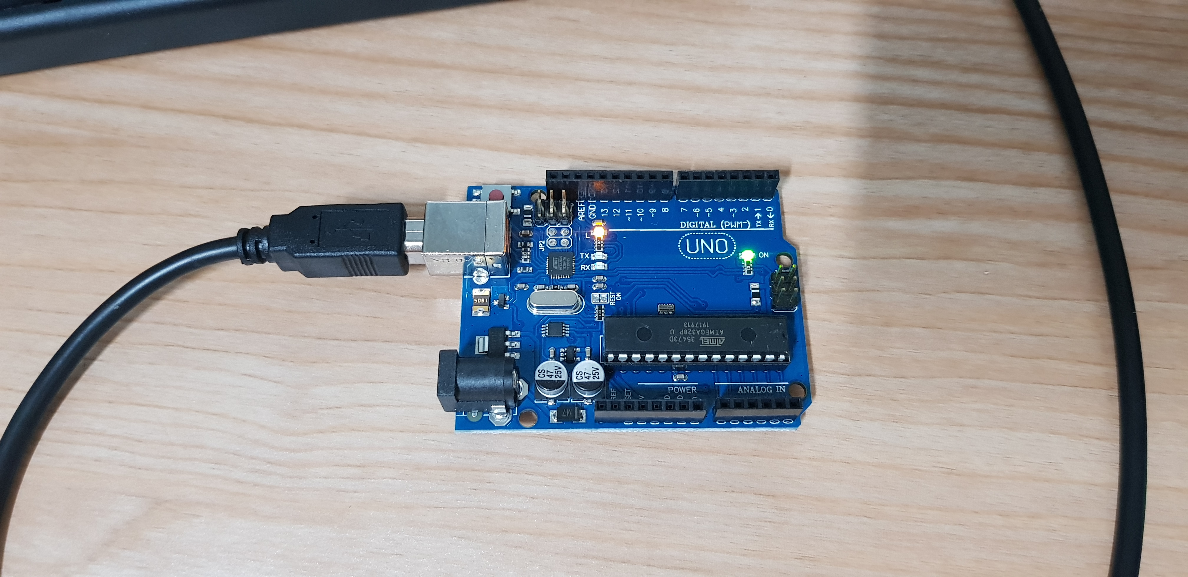 케이블은 'USB2.0 A-B 케이블' 타입이고 연결하고 반대쪽 USB를 PC와 연결을 하면 보드에 사진과 같이 불이 들어오는 것을 확인할 수 있어요. 우측에 노란색 LED는 전원이 들어오면 켜지게 되는 LED 입니다.
