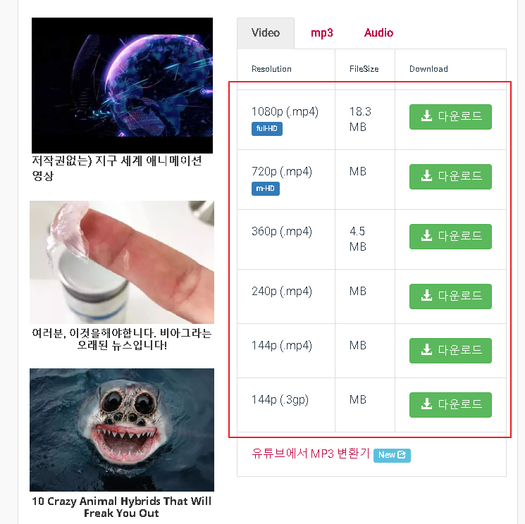 로딩이 완료가 되면 아래쪽으로 내려서 추출된 영상 중에 내가 원하는 해상도를 선택한 뒤에 다운로드 버튼을 눌러주시면 되겠습니다.