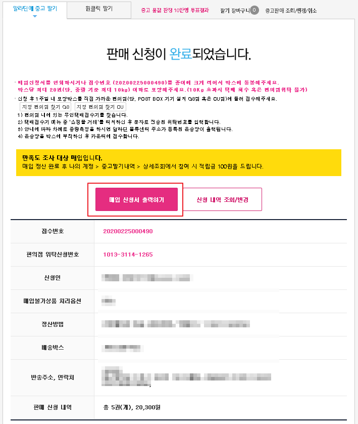 신청이 완료되면 '매입 신청서 출력하기' 버튼을 눌러 매입 신청서와 함께 택배를 보낼 상자를 포장해주시면 되겠습니다.