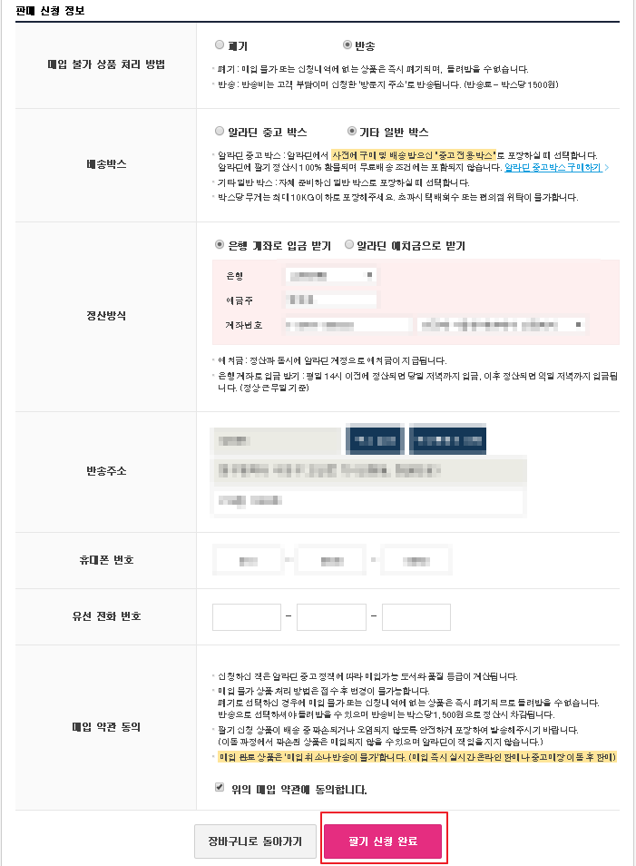 판매가 완료되고 입금받을 계좌를 작성하고, 저 같은 경우는 '매입 불가 상품 처리 방법'으로 '반송'을 선택했습니다.