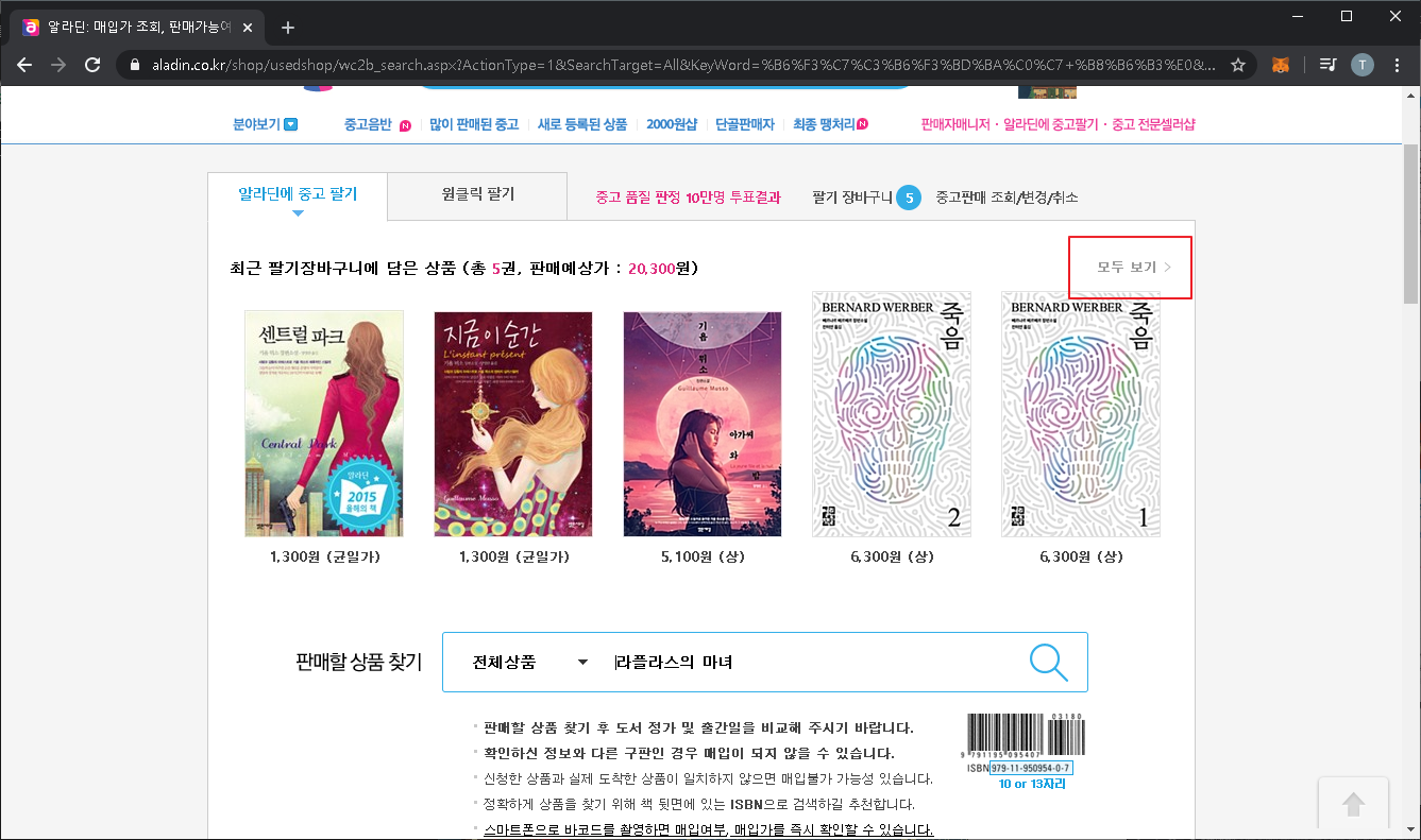 판매할 책을 모두 선택하셨으면 상단에 있는 '모두 보기' 버튼을 눌러 페이지를 이동하겠습니다.