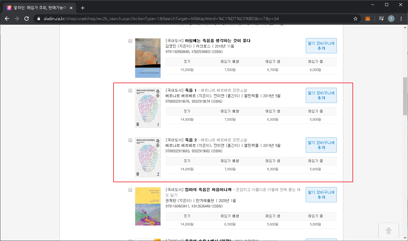 최근에 구입한 베르나르 베르베르의 '죽음', 기욤 뮈소의 책 3권을 판매하려고 추가한 모습입니다.