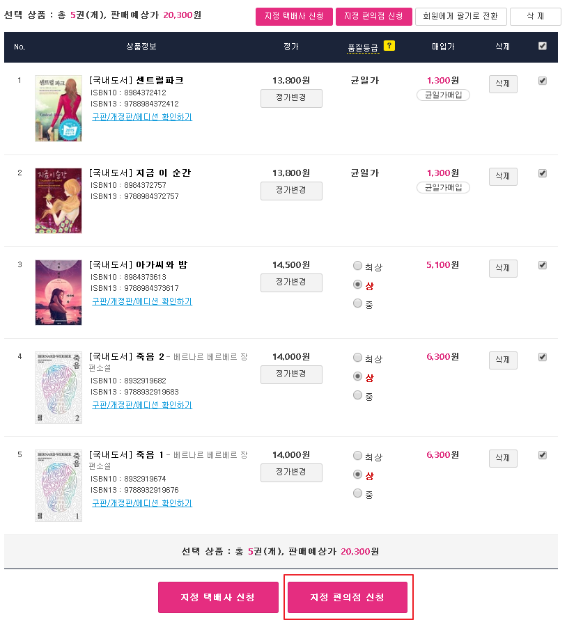 알라딘에서 모든 책을 구매하는게 아니라 재판매가 가능한 정도의 상태를 유지한 책들만 선별적으로 받고 있기 때문에 만약 판매가 불가능하다는 심사 결과를 받은 책이 있다면 다시 받기 위해서 체크를 한 목록입니다.