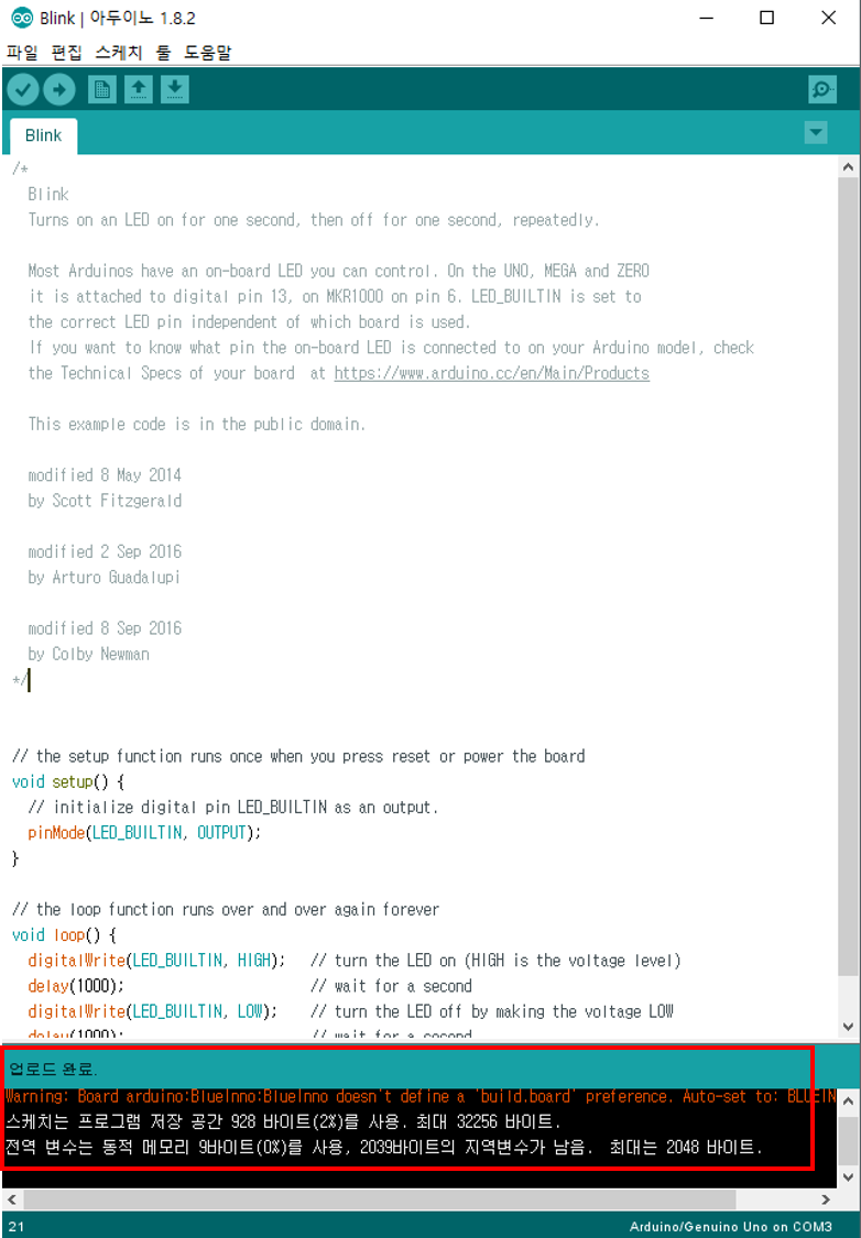 업로드 완료가 되고 프로그램이 아두이노 보드에서 얼마만큼의 메모리를 사용하는지에 대한 정보가 같이 표시되고 있습니다. (위 사진에 보이는 경고메시지[warning]는 제 개발환경 문제로 표시되는 문구는 조금 차이가 있을 수 있습니다.)