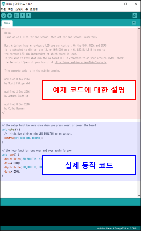 위에 길고 긴 영어를 지나치면 실제 LED가 깜빡이는 동작을 하는 실행 코드가 나와있는데, 10줄 정도의 짧은 코드로 LED를 제어할 수 있는 것을 확인할 수 있어요. 코드에 대한 설명은 다음 포스팅에서 이어 나가겠습니다.