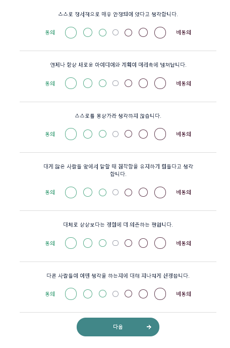 해당 성격유형검사는 간단하게 수행이 가능해서 가볍고 재밌게 사용가능합니다.