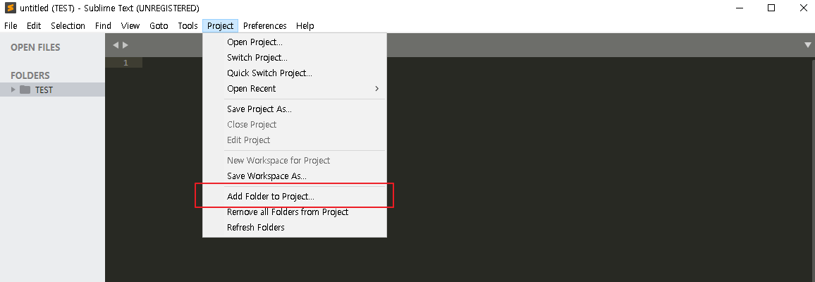 그 다음에 실행한 서브라임텍스트로 와서 [Project] 탭을 클릭한 다음 'Add Folder to Project'를 클릭해주세요.