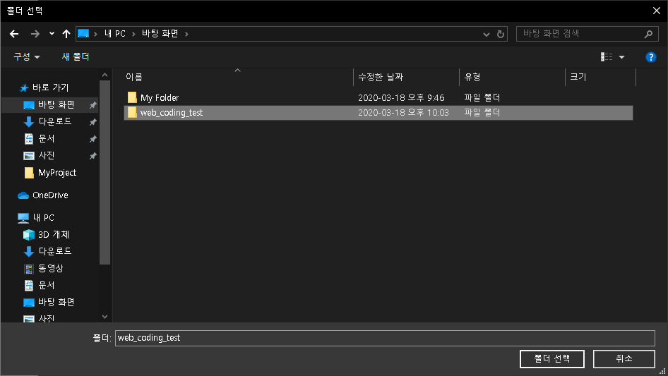 바탕화면으로 가서 내가 만든 폴더를 선택한 다음에 폴더 선택를 들어가신 뒤에 폴더선택 버튼을 눌러 주시면 되겠습니다.