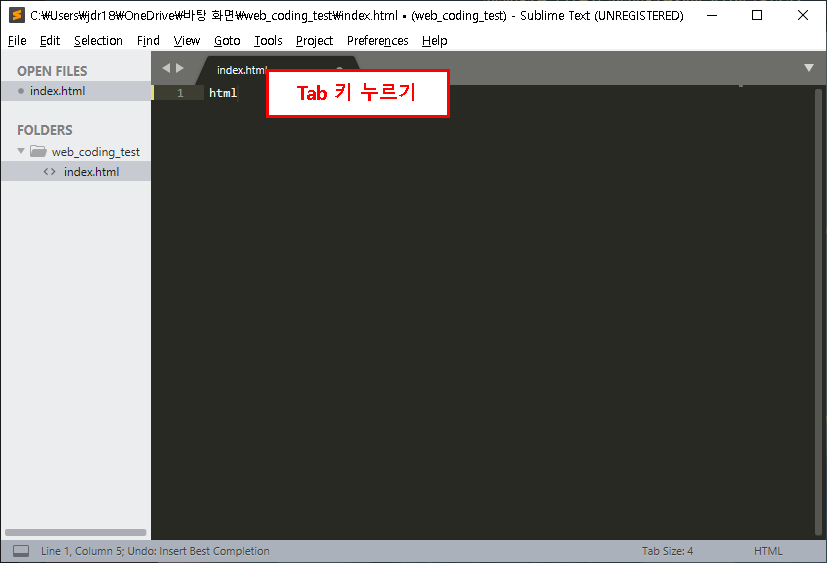그런 뒤에 1번째 줄에서 'html'을 입력하신 뒤에 키보드의 [Tab] 키를 눌러주세요.