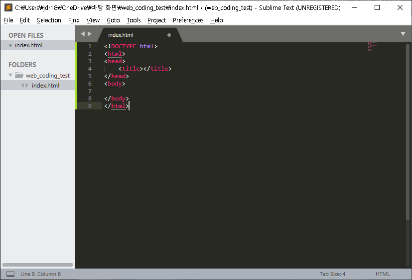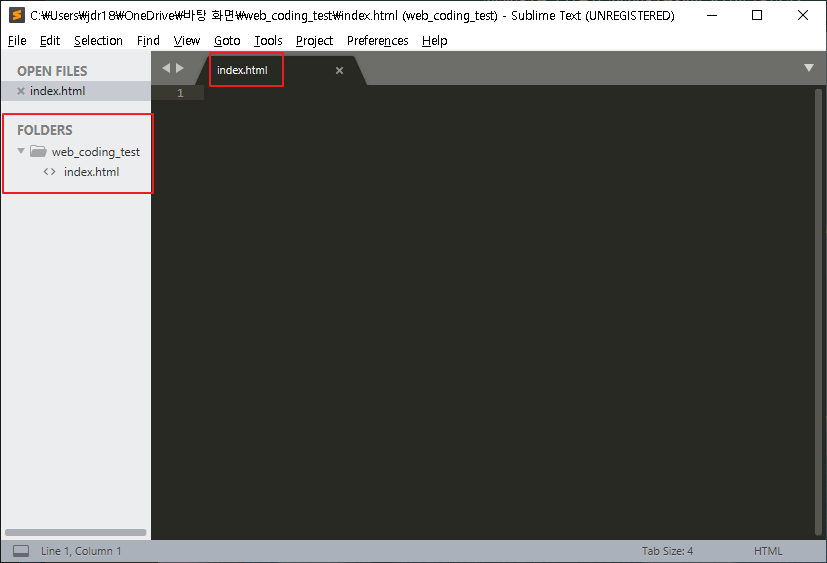 그러면 'untitled'로 되어 있던 파일의 이름이 내가 저장한 'index.html' 로 변경되어 있는 것을 확인할 수 있습니다.