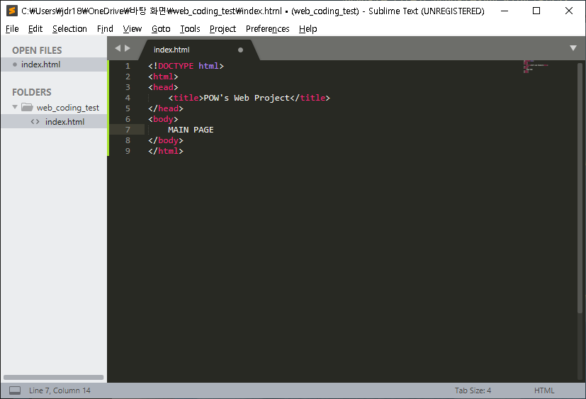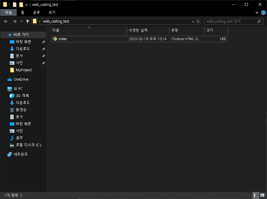 저장을 완료하고 만들어 놓은 프로젝트 폴더로 이동해서 'index' 파일을 더블 클릭해주시면 되겠습니다.