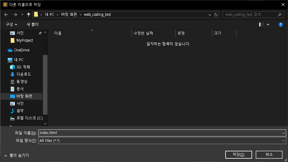 그럼 프로젝트 폴더에 파일 이름을 'index.html'로 입력한 뒤 '저장' 버튼을 눌러 파일을 저장하겠습니다.