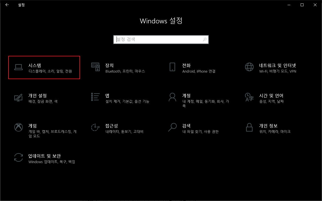 먼저 'Windows 설정'으로 들어가서 '시스템' 버튼을 눌러주시면 되겠습니다.