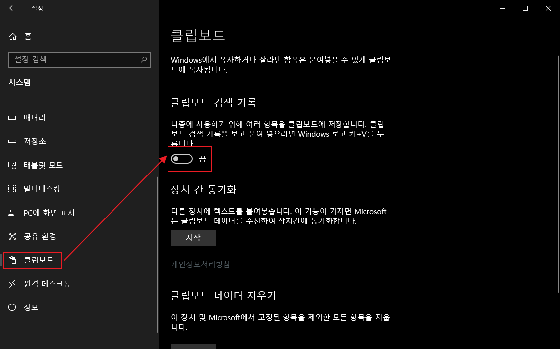 "Windows 설정에서 클리보드 기능 활성화 시키기"