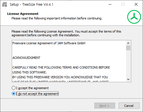 언어를 선택하고 나면 우리가 알던 일상적인 설치 창과 동일하게 사용자 라이센스에 동의하는지 대한 선택 창이 나타납니다.