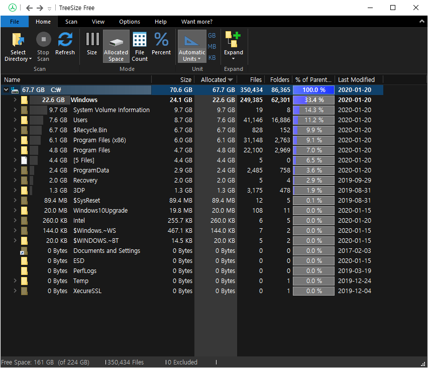 그런 뒤에 자동으로 프로그램이 재실행되는데, 재실행된 뒤 조금만 기다리면 C 드라이버 내부에 폴더가 각 폴더별로 얼마만큼의 용량을 차지하는지에 대해서 확인할 수 있습니다.