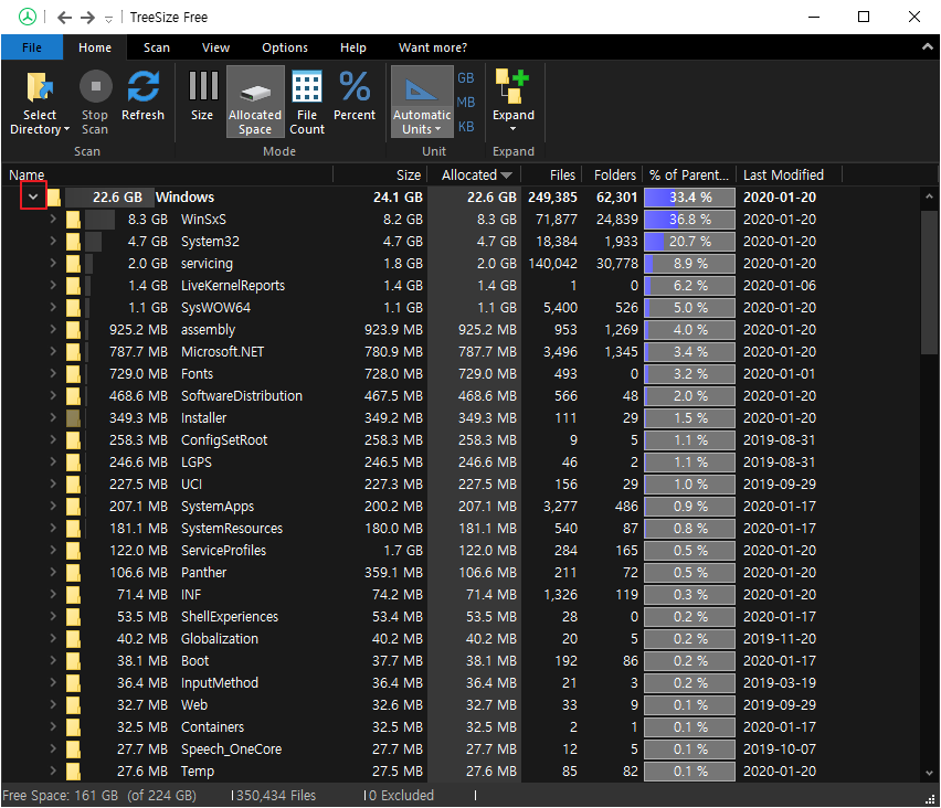 그렇다면 여기서 내가 더 상세하고 보고 싶은 폴더 앞에 있는 화살표 버튼을 누르면 내부에 있는 모든 폴더들도 세분화되어서 각 폴더가 차지하고 있는 용량에 대해서 자세하게 확인할 수 있습니다.