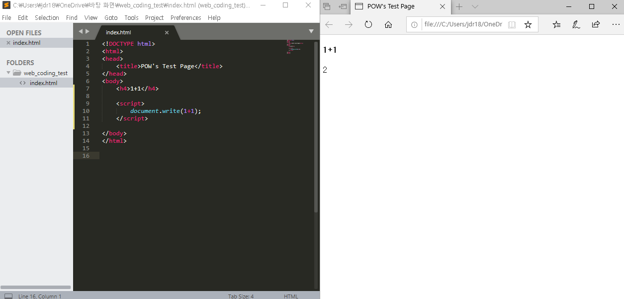 하지만, 자바스크립트 구문 안에서 입력된 1+1은 실제 해당 수식의 결과값인 '2'가 화면에 출력이 되는 것을 볼 수 있습니다.