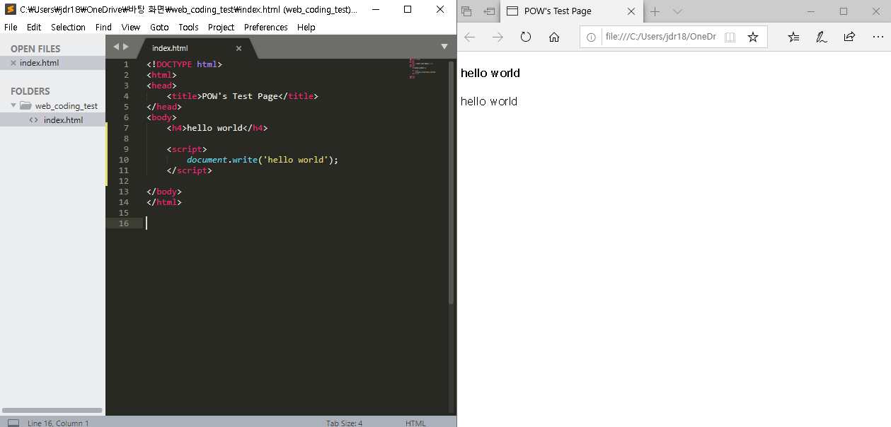 먼저 비슷하게 'hello world'라는 문구를 출력해보면 다음과 같이 강조된 표시는 조금 다르지만 동일하게 문자가 나타나는 것을 볼 수 있습니다.('document.write'는 자바스크립트에서 사용되는 코드 중 하나입니다)