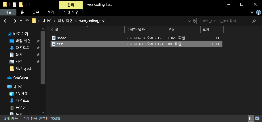간단하게 일단 이미지 하나를 'test'라는 제목으로 변경해서 프로젝트 폴더 안으로 옮겨보겠습니다.
