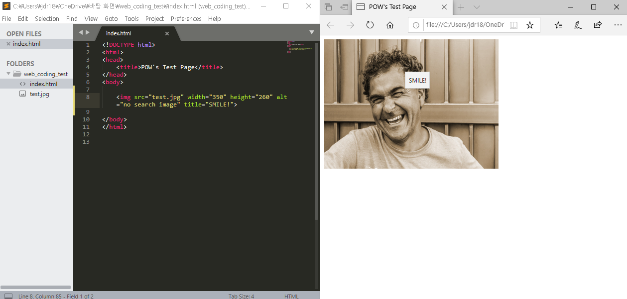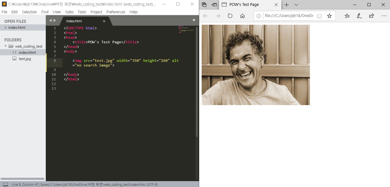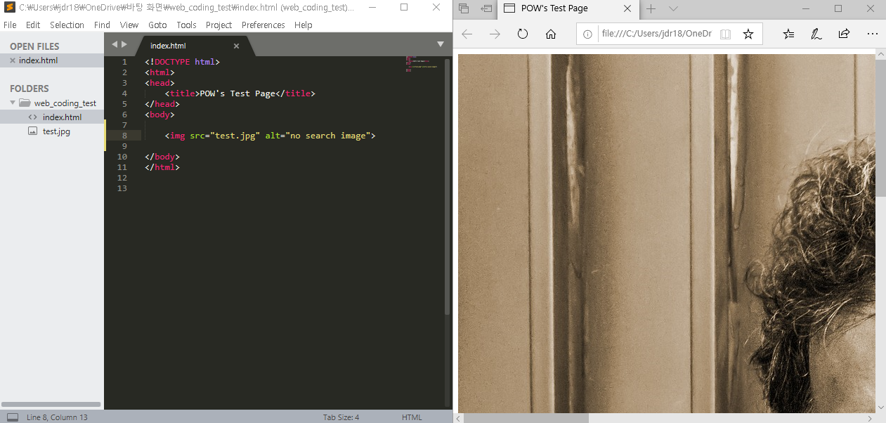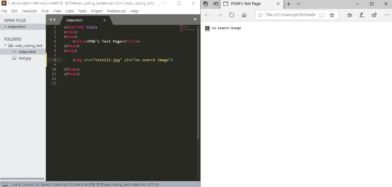 다음과 같이 이미지 파일의 경로와 파일명을 똑바로 입력하지 않고 저장을 한 뒤 웹페이지를 열어 보게되면 이미지 파일을 찾지 못해 alt 속성 안에 있는 'no search image' 라는 문구가 출력되는 것을 볼 수 있습니다.