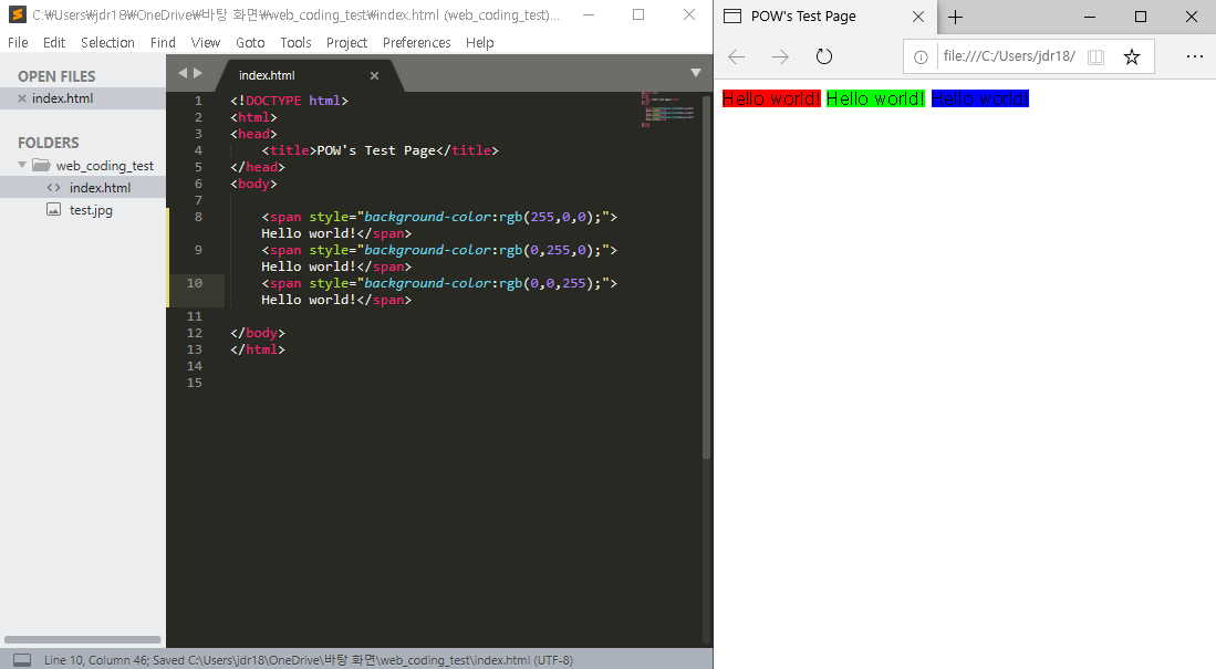 보시면 다음과 같이 background-color 속성에서 설정된 RGB 값에 따라 배경 색깔이 변경되는 것을 확인할 수 있습니다.