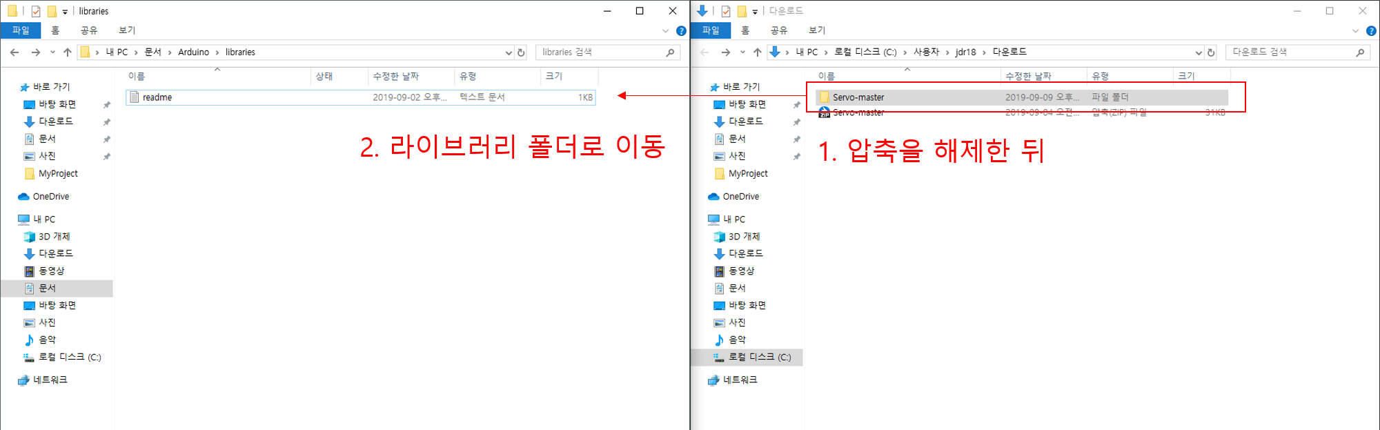 다음 그림에서와 같이 압축을 해제한 뒤, 라이브러리 폴더로 복사하거나 이동해주시면 됩니다.