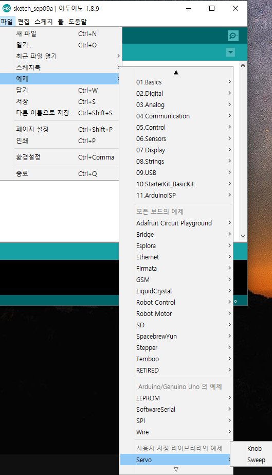 이렇게 추가하고나서 아두이노 개발 프로그램을 실행해 라이브러리가 새로 추가된 것을 확인하기 위해 [파일] - [예제] 탭으로 이동해 제일 아래에 '사용자 지정 라이브러리의 예제'까지 내려보시면 [Servo] 라이브러리가 추가된 것을 확인 할 수 있습니다. (아두이노가 실행되고 있는 상태이면, 종료하고 다시 개발 프로그램을 실행시켜 주세요.)