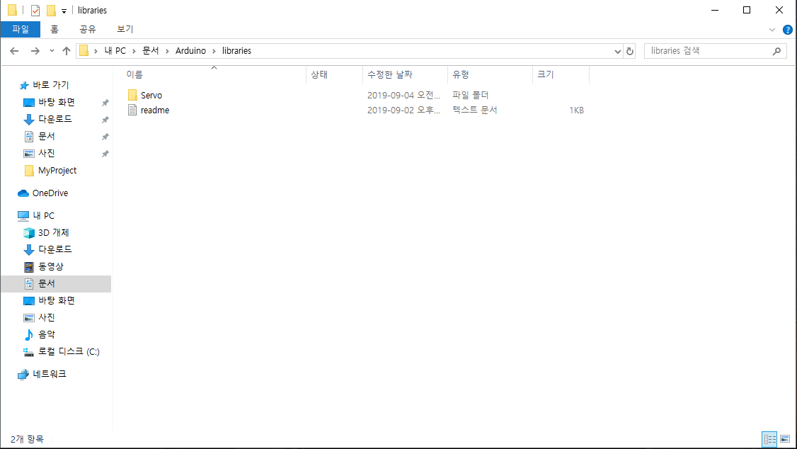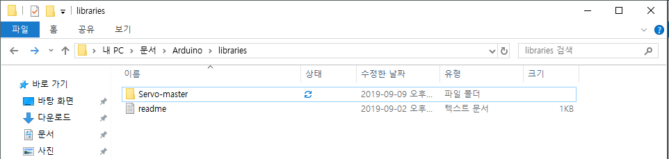 경로는 기본적으로 [문서] - [Arduino] - [libraries] 폴더로 이동하면 마지막에 추가했던 [Servo] 라이브러리 폴더를 확인할 수 있습니다. 간단하게 이 폴더를 모두 삭제를 해준 뒤,