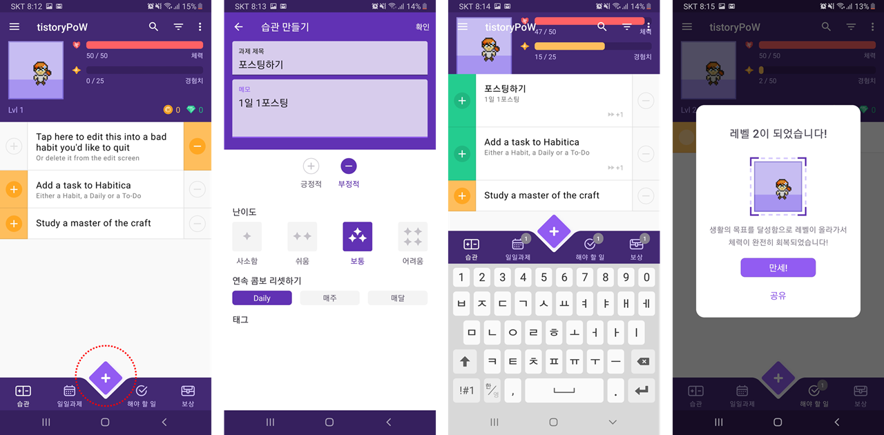 일단 매일 해야 되는 일 단위의 습관부터 채워놓고 사용해보고 있고, 오늘 더 찾아보니 레벨업을 하고 장비를 구매하고 하면 나중에는 보스도 잡을 수 있다고 해서 조금 목표의식도 생기는 것 같습니다.