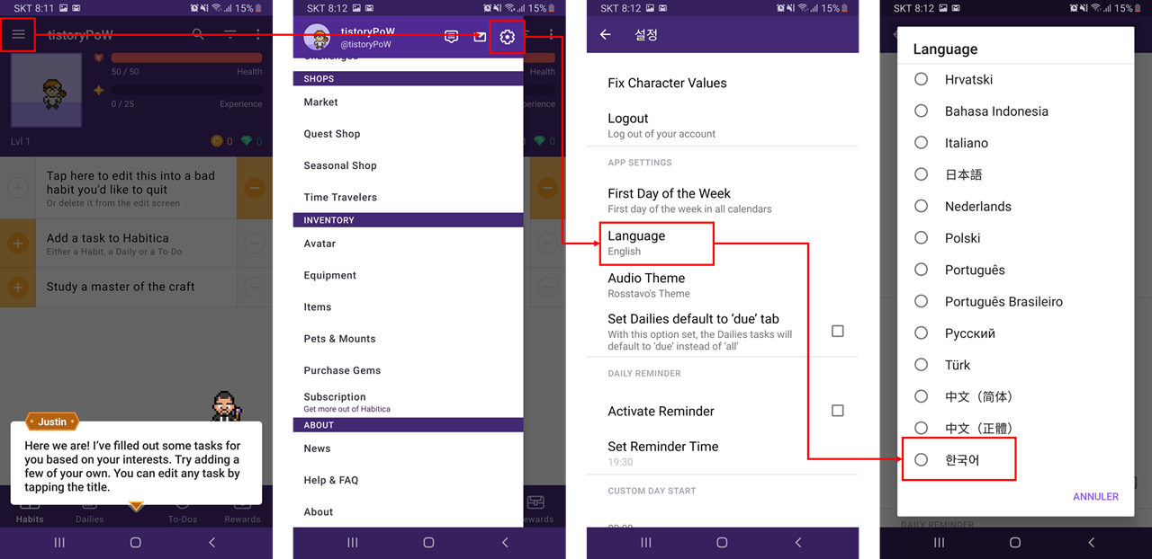 아래 순서대로 도움말이 끝난 뒤 설정 버튼을 눌러 언어에서 제일 아래에 있는 '한국어'를 눌러주시면 되겠습니다.