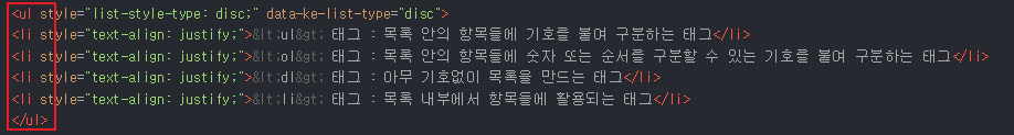 위에 글을 보시다시피 항목 앞에 기호로 목록이 구분되어 있는 것을 확인할 수 있고, HTML 모드로 들어가서 확인해보면 <ul> 태그가 사용이 되어있는 것을 확인할 수 있습니다.
