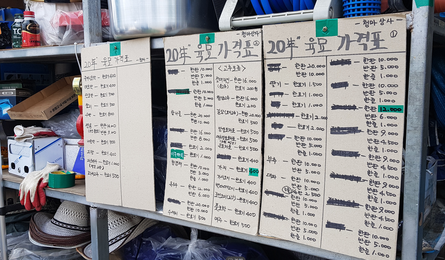 조금만 안쪽으로 들어가보면 현재 있는 모종이랑 가격을 확인할 수 있었고, 그 아래에 있는 메모지에 적어서 건내주면 포장해주는 방식이었습니다.