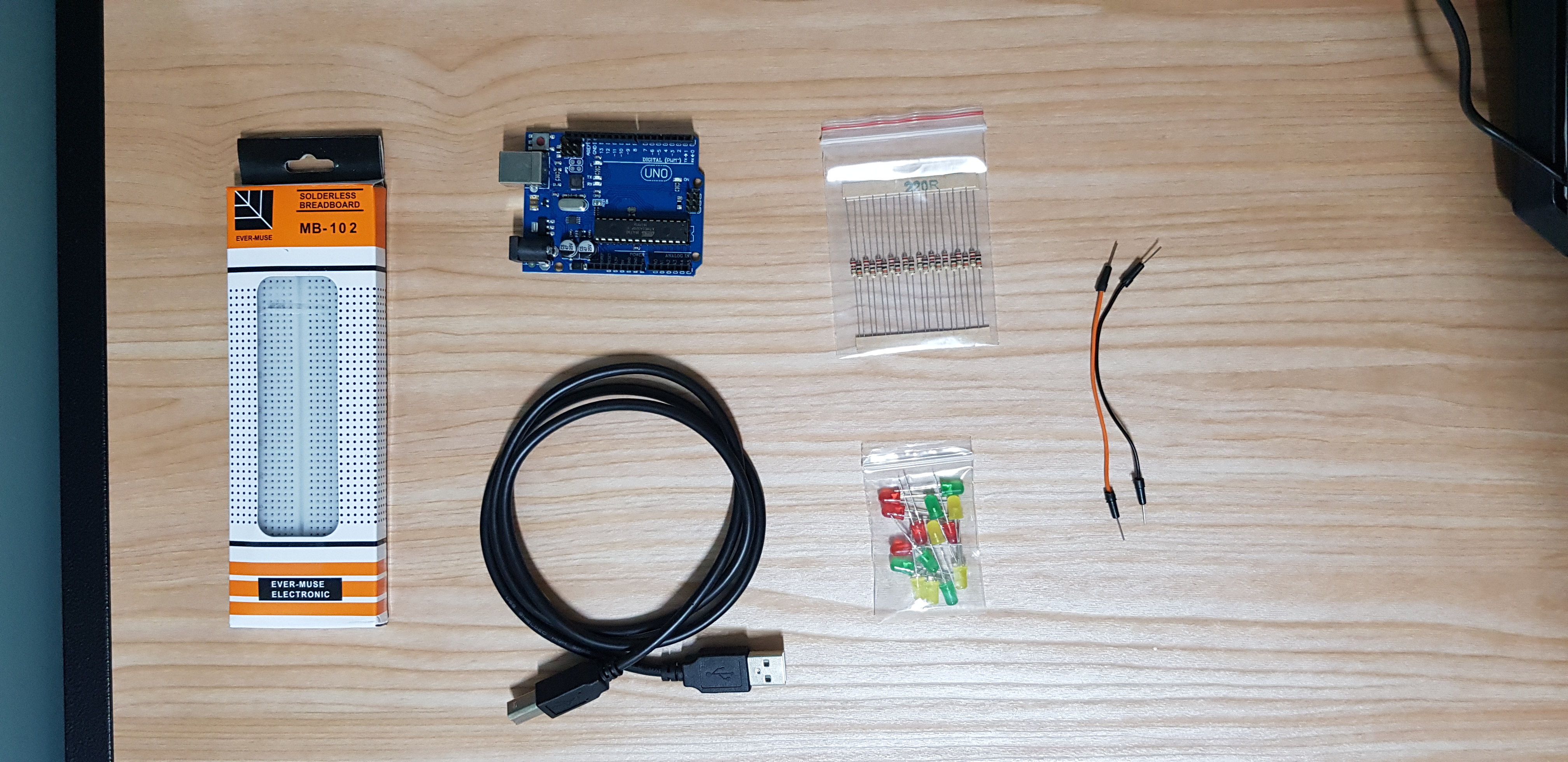 먼저 아두이노를 이용해 외부 LED를 연결하고 제어하기 위해서 키트에서 필요한 준비물을 꺼내보면 다음처럼