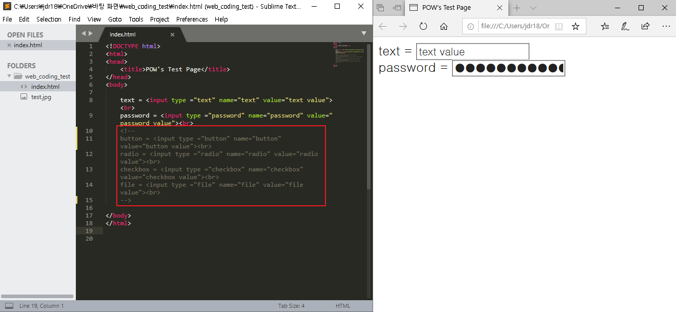 이 부분은 프로그램 개발 툴에 따라 조금씩 차이가 있을 수 있지만, 기존에 코드와 다른 색으로 일괄 변경된 다음에 저장을 하고 작성한 웹페이지를 다시 열어보면 주석처리를 한 부분이 모두 사라져 있는 것을 확인할 수 있습니다.