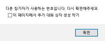 이렇게 동일한 스마트폰 번호를 입력하게 된다면 이미 다른 참가자가 사용중인 번호라고 알림창이 나타납니다.
