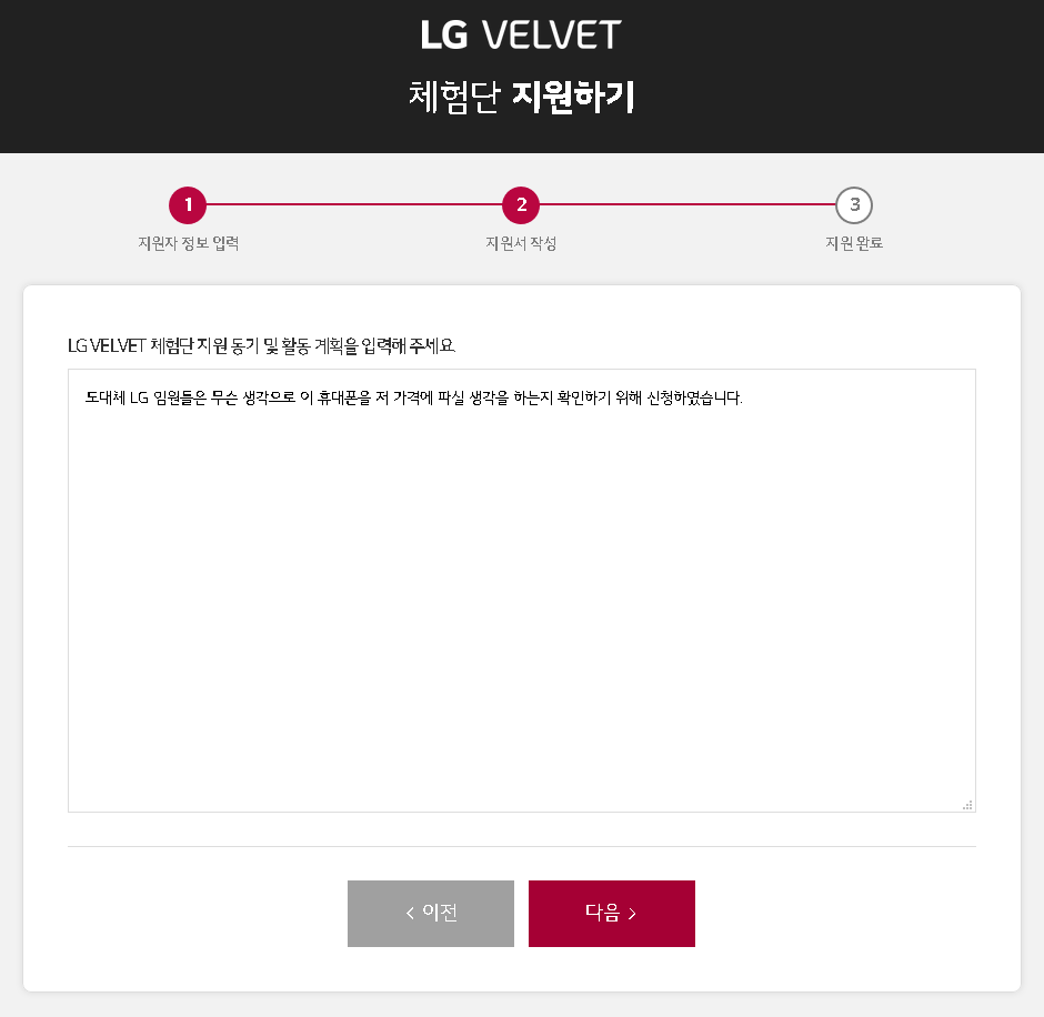 사실 300명의 체험단을 모집하는거기 때문에 안될 가능성이 높아보이지만, 밑져야 본전이라는 생각에 정말 좋다면 앞으로의 LG 스마트폰을 더욱 기대할 수 있지 않을까라는 생각에 신청을 했습니다.