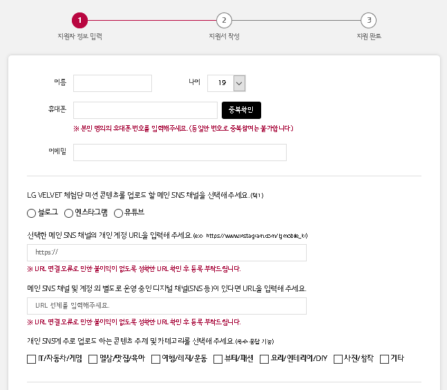 기본적으로 체험단은 SNS 채널을 통한 정보 공유를 목적으로 하고 있어 운영중인 블로그 또는 인스타그램, 유튜브 등의 운영중인 채널이 필요로 합니다.