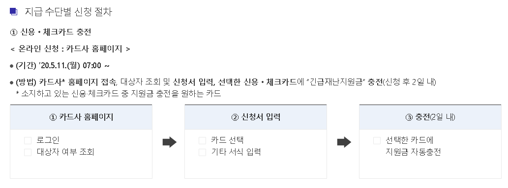 그리고 신청 기간은 지급 수단별로 다르고, 온라인으로 신청을 하는지 오프라인으로 신청을 하는지에 따라서도 기간이 조금 다릅니다.