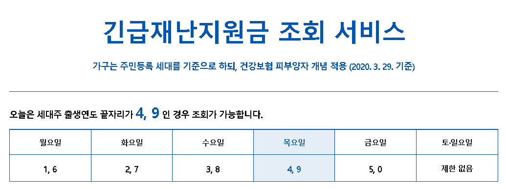 긴급재난지원금 조회 서비스는 마스크 5부제와 같이 요일별로 조회가 가능합니다.