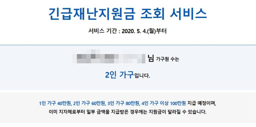 조회를 하고나면 다른 정보가 있을것이라고 생각했었는데, 가구원의 수에 따라 정해진 금액을 지급받을 수 있는 것으로 보입니다.