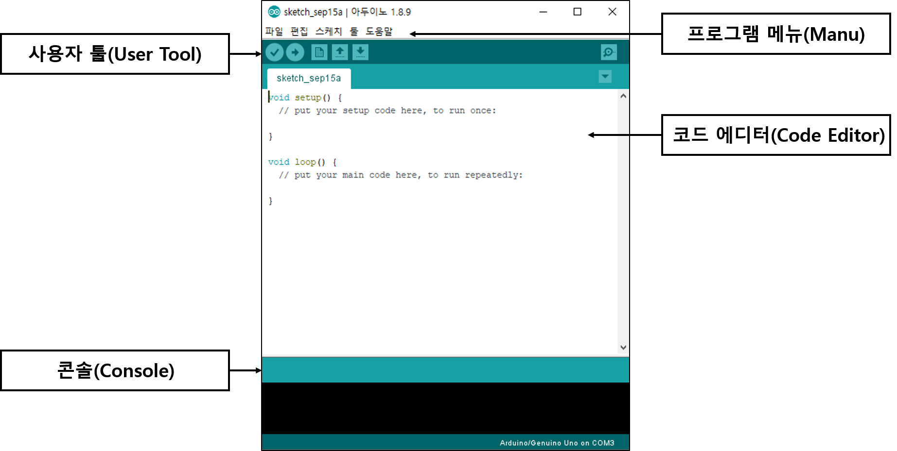 프로그램 메뉴 바 : 파일, 편집, 스케치 등 프로그램의 메뉴를 설정하기 위한 창
