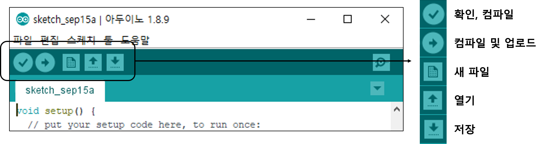 컴파일 및 업로드 : 소스 프로그램을 컴파일 한 뒤 오류가 없는 경우 연결된 보드를 업로드하는 버튼