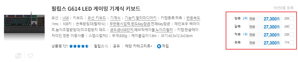 필립스 G614 기계식 키보드 제품은 4가지 축에 대해서 선택해서 구입을 할 수 있습니다.
