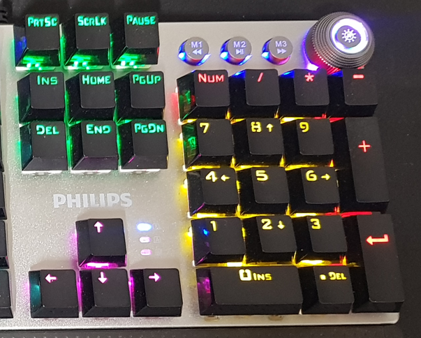 그리고 숫자 패널 위에 멀티미디어 버튼이 들어가 있어서, Caps Lock, Num Lock 등 기능을 표시하는 인디게이터 LED가 방향키 버튼 옆에 있는 것을 확인할 수 있습니다.