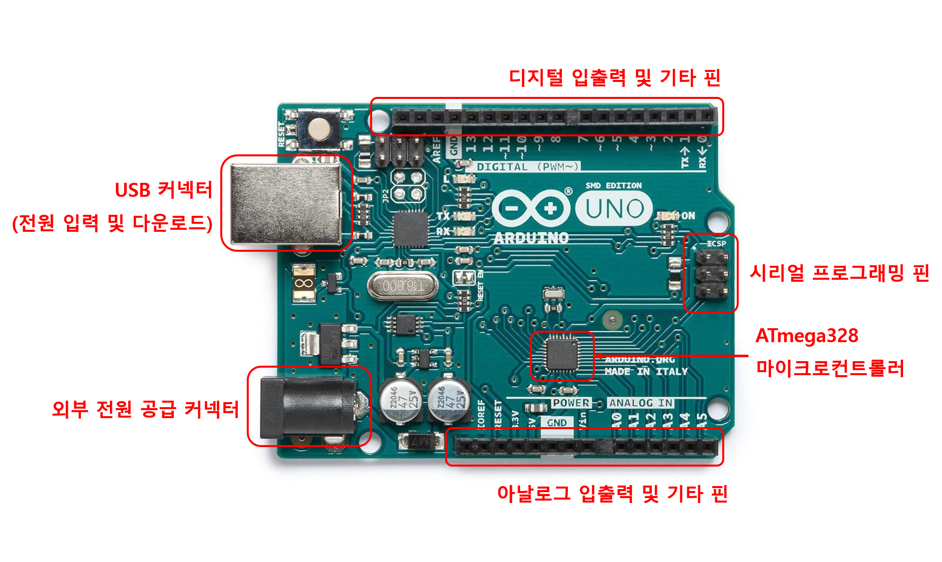 조금더 세부적으로 공급되는 전원을 일정하게 변압시키고 안정화시키는 레귤레이터 및 상태 표시 LED, 내부 클럭을 발생시키는 부품 등이 포함되어 있지만, 처음 접할 때는 위에 부품과 핀들이 어떤 역할을 가진지만 알고 있으면 사용하는데에 있어 큰 무리가 없다.