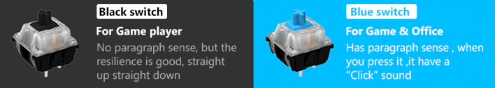 제품 소개 페이지를 살펴보면 흑축 스위치를 사용하는 키보드는 게임을 즐기는 사용자에게 적합하다고 나와있고, 청축 스위치는 게임을 하는 사용자와 오피스, 즉 사무실 용도라고 적혀있습니다.