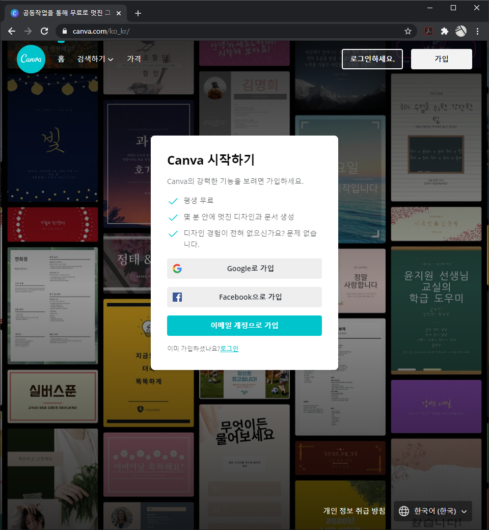 첫 접속 화면에서 보면 Canva를 시작하기 위해 로그인이 필요하다는 것을 알 수 있습니다.